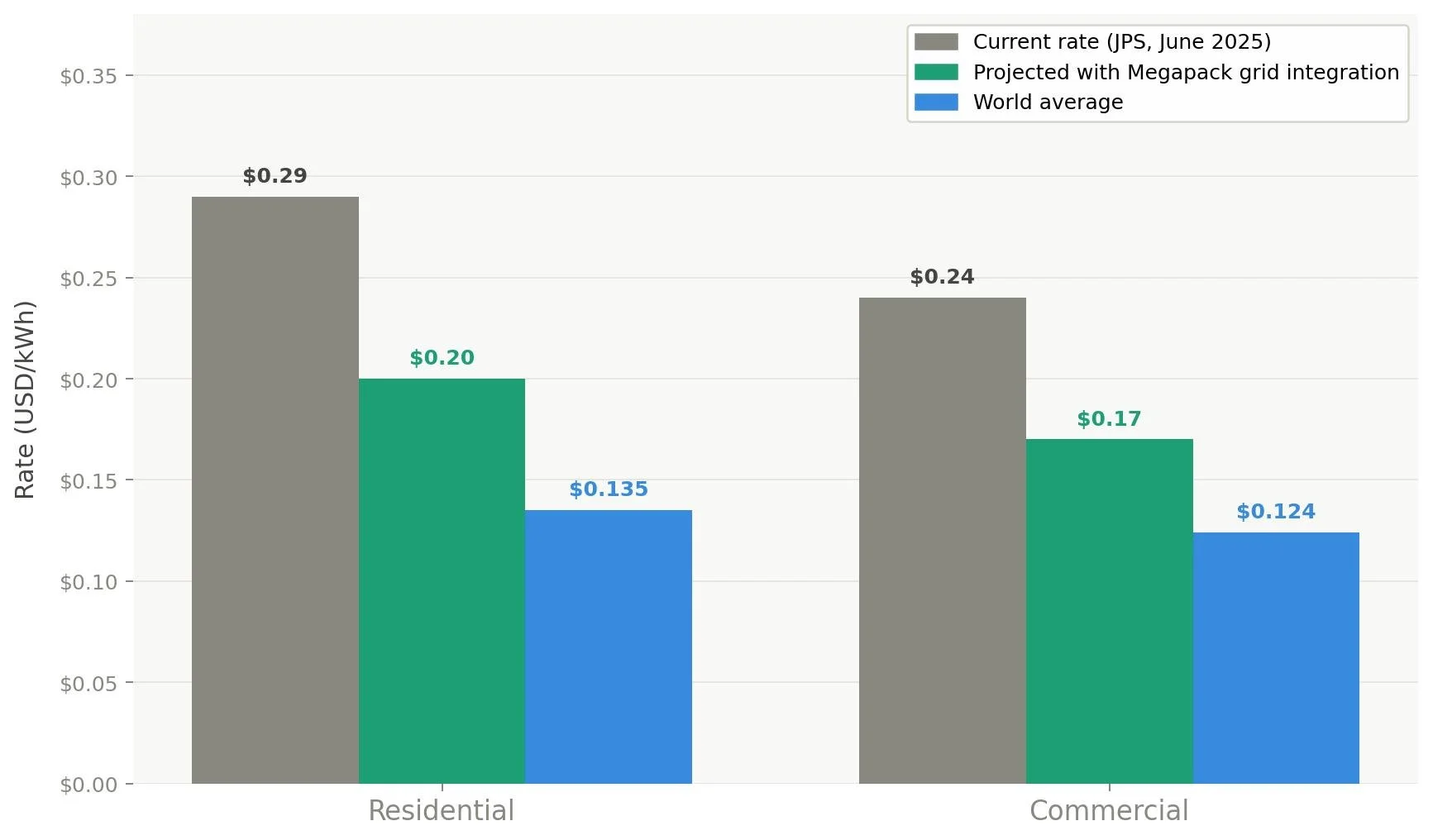 By integrating utility-scale battery energy storage systems like the Tesla Megapack into Jamaica's grid, Smart Energy Ltd projects a 25–30% reduction in electricity rates for both residential and commercial customers. Instead of relying on expensive diesel peaker plants to meet demand, stored energy can be dispatched instantly and cleanly — cutting fuel costs, stabilizing the grid, and passing real savings directly to consumers. The green bars represent what's possible when the right technology meets the right vision.